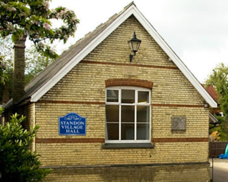 A120 from Bishop’s Stortford or A10, at bottom of hill in Standon turn into Standon High Street (left if travelling towards A10 and right if travelling towards Bishop’s Stortford). Continue past the shops on your right and St. Mary’s Church on your left. The Village Hall is on the right hand side with parking on the road. Sat Nav code SG11 1LE.